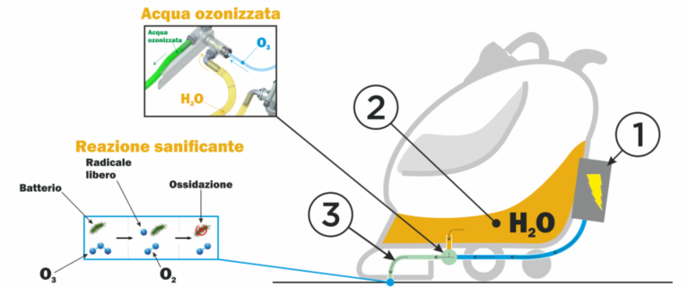 Il sistema Ozono Adiatek come funziona Il generatore di Ozono è contenuto in una scatola (1) posta nella parte posteriore della lavasciuga e dalla quale viene emesso il gas Ozono. Contemporaneamente dal serbatoio l’acqua attraverso il tubo (2) va al miscelatore, da questo momento acqua e Ozono si mescolano e attraverso il tubo (3) sono rilasciati sulle spazzole. L’Ozono si mescola con l’acqua “istantaneamente” e quindi il generatore produce Ozono solo quando necessario, cioè quando la soluzione scende sulle spazzole. Quando la macchina è ferma è disabilitata anche la produzione di Ozono, impedendo quindi la dispersione del gas nell’ambiente.